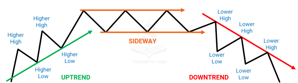- Thị trường di chuyển theo 2 xu thế: Xu thế chính và xu thế hồi (phụ). Để xác định xu thế tăng tiếp diễn, cần thấy giá đạt mức cao mới (Higher High); ngược lại với xu thế giảm.